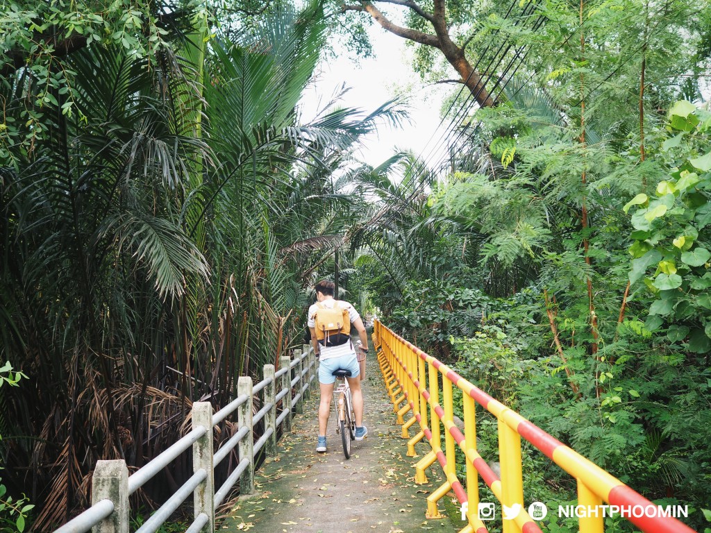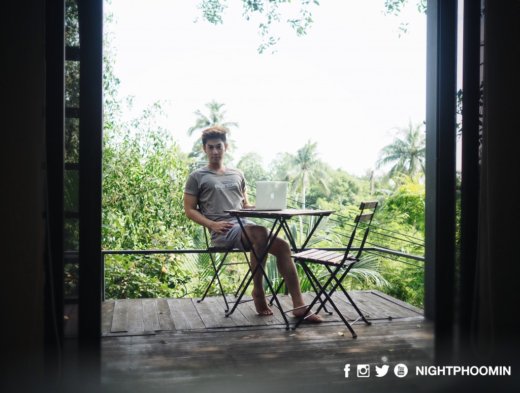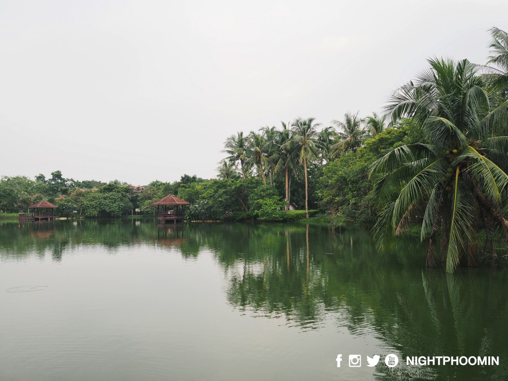 พอกลับมาถึงโรงแรม เราก็ทำการเปิดกระเป๋าเตรียมของ เพื่อจะอาบน้ำเปลี่ยนเสื้อผ้า เตรียมตัวเข้านอน สำหรับวันเสาร์ เวลา 4 ทุ่มในกรุงเทพฯ ผู้คนคงเพิ่งออกจากห้าง ความวุ่นวายยังคงมีอยู่ตลอดคืน แต่ไม่น่าเชื่อว่า เพียงเราพาตัวเอาข้ามแม่น้ำเจ้าพระยามาอีกฝั่งแม่น้ำ ในเวลาเดียวกันที่นี่กลับมืดมิด สัมผัสได้เพียงความสงบ เสียงแมลง และเสียงลมที่พัดผ่านต้นไม้เท่านั้น … พอเราตื่นในตอนเช้า เปิดประตูระเบียง คุณจะเห็นกระรอกวิ่งบนต้นไม้มาทักทายคุณจนเป็นเรื่องปกติ เสียงนกร้องออกหากิน และอากาศเย็นๆสดชื่นหลังฝนตกปรอยๆตลอดคืน ช่างเป็นเช้าที่สดใสอีกหนึ่งวัน หลังจากล้างหน้าแปรงฝัน ผมก็พาตัวเองออกไปปั่นจักรยานรับแสงแดดอ่อนๆ และถ่ายรูปสวยๆเพื่อเก็บเป็นความประทับใจ (จากที่โพสๆด้านบนที่ทุกคนได้อ่านผ่านมาแล้ว)