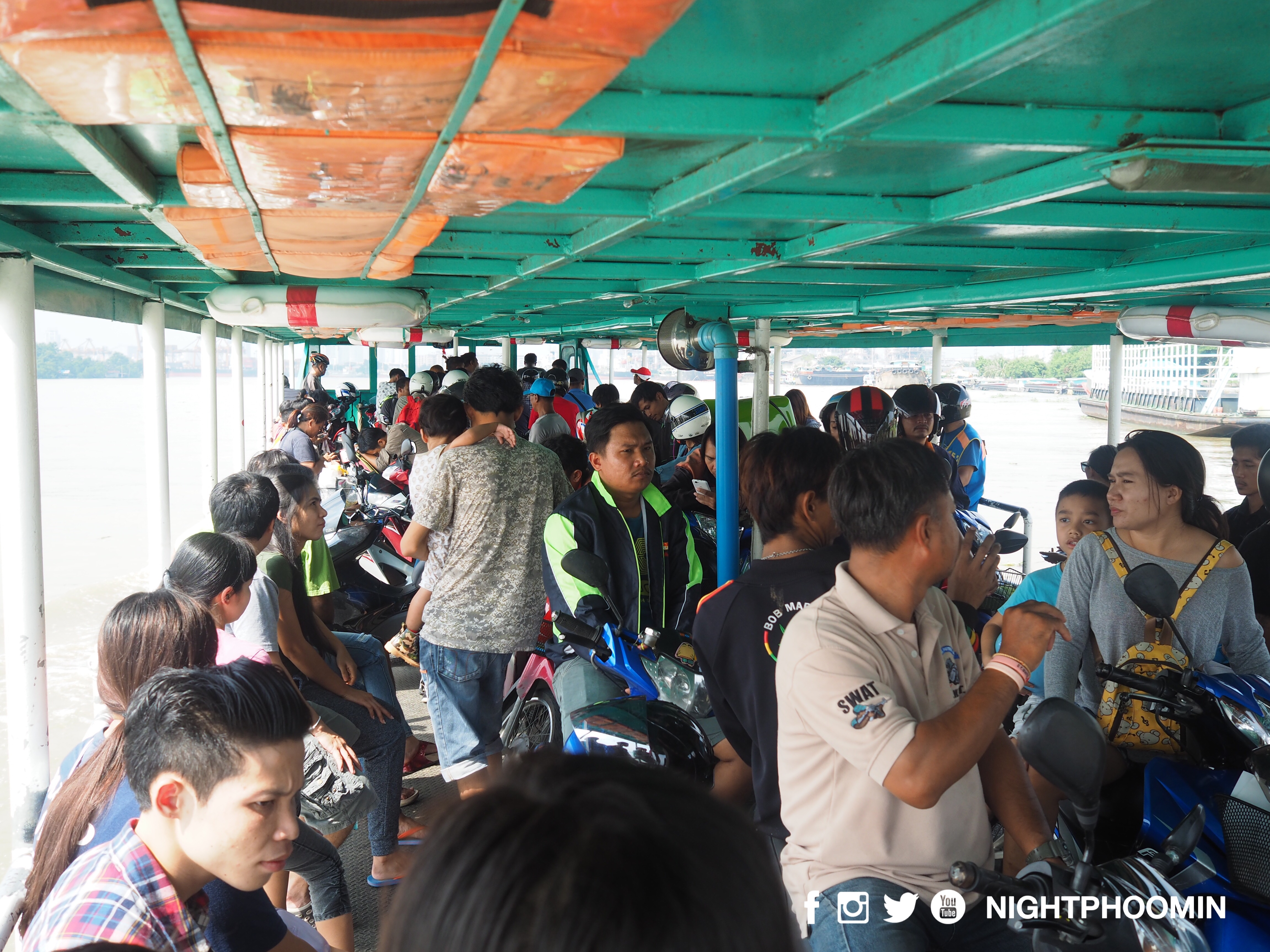 สภาพบนเรือข้ามแม่น้ำมีขนาดใหญ่ สามารถรองรับทั้งคนและรถจักรยานยนต์หลายคัน เริ่มบริการตั้งแต่ตี 5 จนถึง 3 ทุ่ม เรือใช้เวลาข้ามไม่นาน เราก็มาถึงท่าเรือวัดบางน้ำผึ้งนอก เดินออกไปสู่ทางออก จ่ายเงิน 4 บาท เป็นสัญญาณบอกว่า… “ชีวิตอยู่ใกล้ธรรมชาติของคุณได้เริ่มต้นแล้ว” ถ้ามองไปรอบๆจะเห็นบริการเช่ารถจักรยาน เพื่อปั่นบริเวณรอบบางกระเจ้า ซึ่งเป็นกิจกรรมที่นักท่องเที่ยวมักจะทำเมื่อมาเยือนที่นี่ แต่จุดประสงค์ของผมไม่ใช่แค่มาปั่นจักรยานเท่านั้น แต่ผมมานอนและซึมซับอ็อกซิเจนของกรุงเทพฯให้มากที่สุด แม้จะแค่คืนเดียวก็ตาม