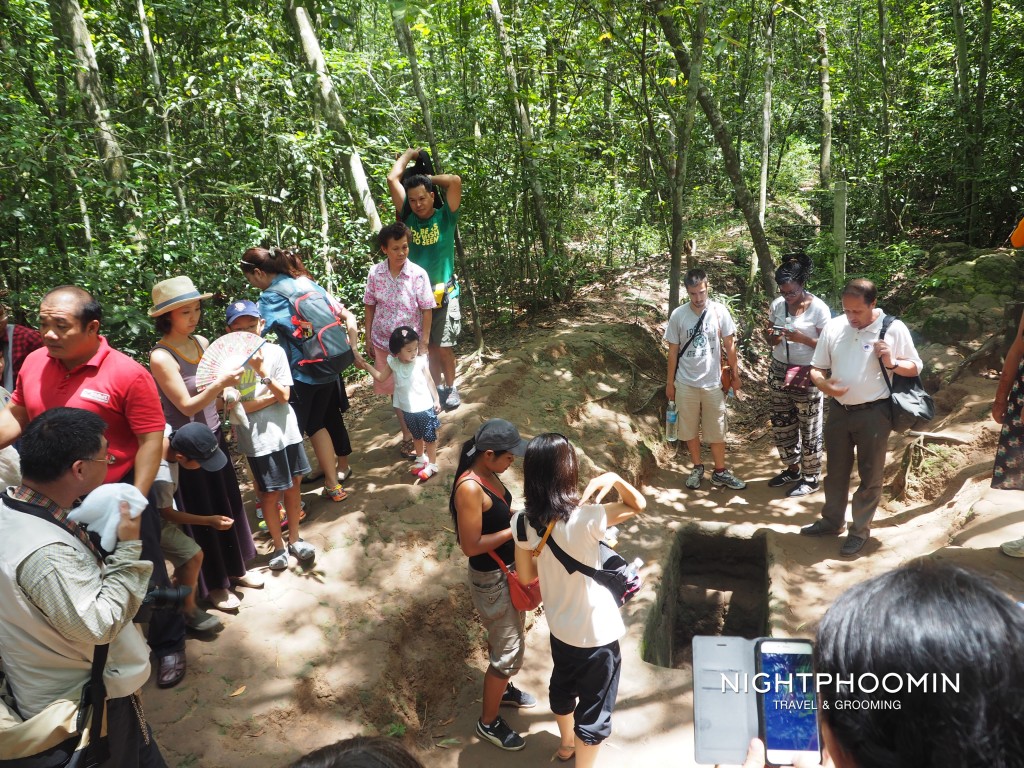เวลาประมาณ 10 โมงเช้า เรามาถึงที่อุโมงค์กู๋จี เดินจากที่จอดรถเข้ามาจะเจออาคาร Book Office เพื่อทำการจ่ายค่าเข้าคนละ 110,000 ดง หรือ 175 บาท แล้วเดินตามๆกันเข้าไปเป็นทางยาวๆจนผ่านช่องตรวจตั๋ว พอสุดทางเราจะเป็นพื้นป่าที่เต็มไปด้วยต้นไม้และมีนักท่องเที่ยวหลายกลุ่ม ยืนอยู่ตามจุดที่เป็นอุโมงค์ ซึ่งหลายอุโมงค์สามารถลงไปได้ แต่ช่องทางที่เชื่อมต่อกันไม่มีแล้ว แต่บางจุดสามารถลงไปและเดินทางไปโผล่อีกอุโมงค์หนึ่งได้ ซึ่งอุโมงค์ที่สามารถใช้ได้นั้น ทางการได้ขยายอุโมงค์แล้ว เพื่อให้พอดีกับขนาดรูปร่างของชาวตะวันตกครับ
