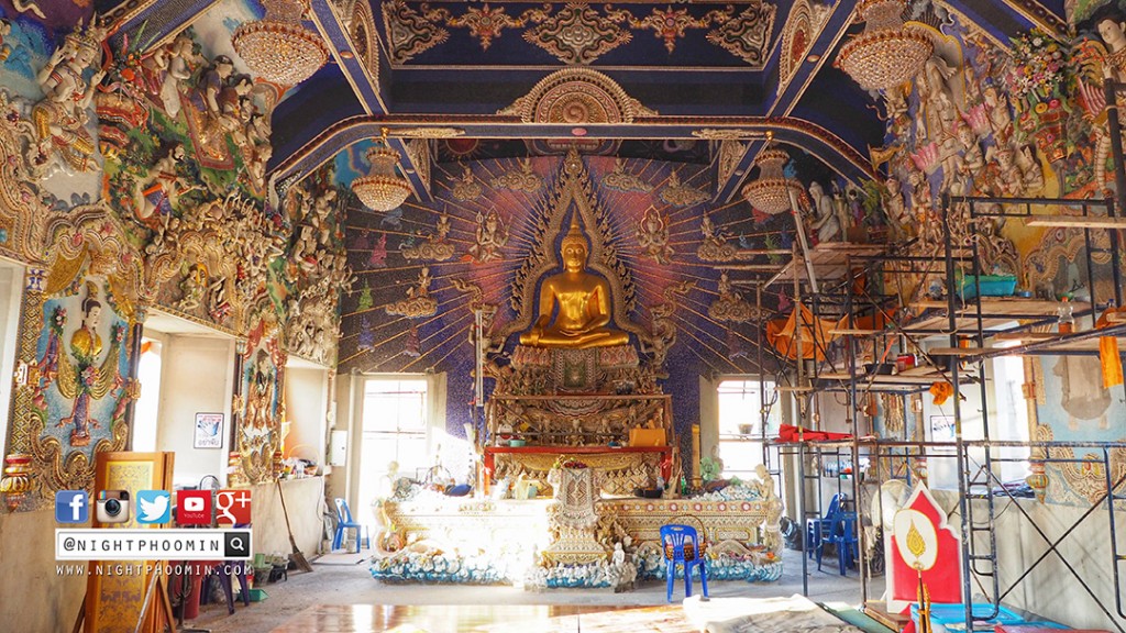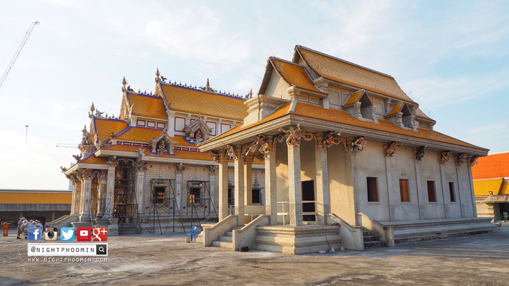 เมื่อเราเข้ามาในบริเวณวันจะเห็นพื้นที่กลางวัดถูกยกระดับขึ้น มองเห็นวิหารคดหรือระเบียงที่ล้อมรอบวิหาร-โบสถ์ ทั้งสี่ด้านที่กำลังก่อสร้าง เดินผ่านวิหารคดเข้าไป ส่วนด้านบนสุดนั้น กำลังก่อสร้างวิหารและโบสถ์หลังใหม่ โดยใช้ศิลปะปูนปั้นเบญจรงค์ กำกับดูแลโดยอาจารย์สุรินทร์ ภาณุมาศ ที่ทุ่มเททั้งความสร้างสรรค์และกำลังคน เพื่อให้ผลงานออกมาได้สวยงามและน่ามาเยือนที่สุดอีกแห่งหนึ่ของเมืองไทย มีการผสมผสานศิลปะร่วมสมัยวิจิตรพิศดาร ที่ใครเห็นต้องทึ่ง อย่างเช่น ปูนปั้นมนุษย์ในสัญชาติต่างๆหรือนางฟ้าเทวดาในวรรณคดี เป็นต้น ซึ่งงานได้คืบหน้าไปมากแล้ว และในส่วนนี้จะเสร็จภายในเดือนมกราคม 2559 เพื่อจัดการสมโภชต่อไป แต่ในบริเวณนี้รวมทั้งวิหารคดจะเสร็จสมบูรณ์อีก 10 ปี เพื่อเป็นถาวรวัตถุสืบต่อพุทธศาสนาต่อไปอีกนาน