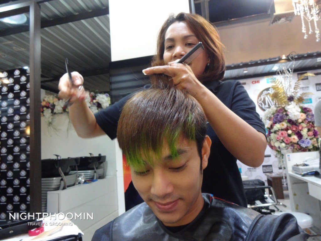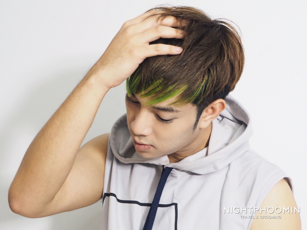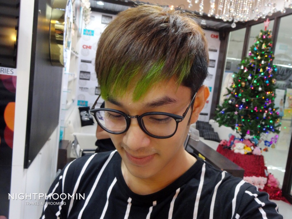 ลุ้นอยู่นานราวๆ 30 นาที สีแดงหลุดออกเกือบผม งานนี้ช่างโล่งอกเลยครับ เพราะตอนแรกกลัวว่าจะออกไม่เยอะ (ลองดูในคลิปนะ จะได้บรรยากาศ) พอเราได้ผมสีบลอนด์ตามที่ต้องการแล้ว ถึงเวลาลงสีผม ซึ่งการลงสีผมสีเขียวนั้น จะลงเป็นช่อๆบริเวณด้านหน้าเท่านั้น ส่วนบริเวณอื่นจะเป็นสีน้ำตาลครับ