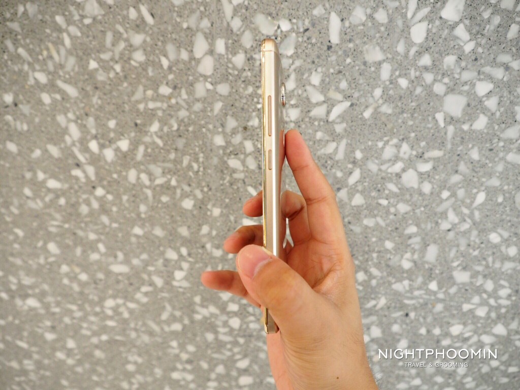 ตัวเครื่องอลูมิเนี่ยมขึ้นรูป โดยมีความบางของอลูมิเนียมเพียง 0.8 มม.ส่วนความบางเครื่อง 8.15 มม. ถ้าเทียบกับ iPhone 6s ที่มีความบาง 7.1 มม. ถือว่าไม่รู้สึกว่าหนากว่าครับ ส่วนการออกแบบตัวเครื่องด้านหลังให้ความรู้สึกโค้งมนแบบสามมิติ ให้ความรู้สึกจับกระชับมือครับ การประกอบตัวเครื่องแน่นดี สมกับเป็นอลูมิเนียม