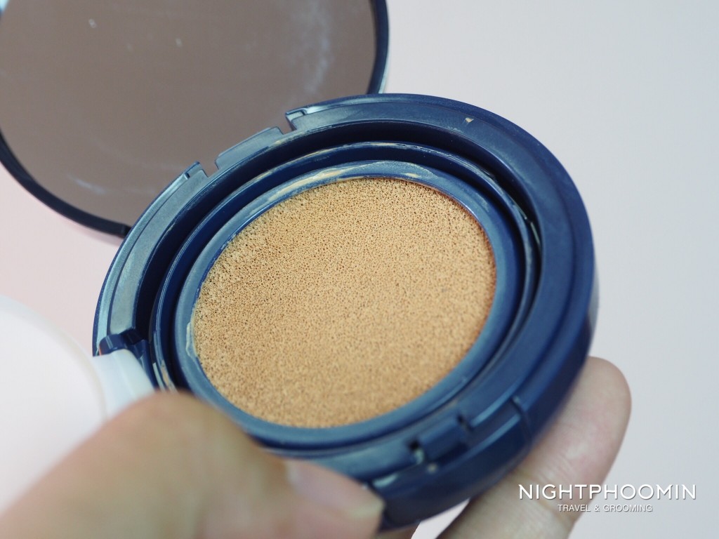 เนื้อสัมผัส-กลิ่น: รองพื้นน้ำบรรจุในฟองน้ำ เฉดสีเดียว ใช้บัฟกดไปที่ฟองน้ำ แล้วแตะที่ใบหน้า เกลี่ยง่าย เนื้อบางเบาไม่หนักหน้า ไม่ปกปิดรอยสิวและรอยดำ(บางมากจริงๆ) ช่วยรูขุมขนดูเล็กลง ผิวดูเรียบเนียนขึ้น เมื่อใช้แล้วระหว่างวันมีความมันวาวเล็กน้อย ถึงแม้ว่าทางแบนด์จะเคลมว่าควบคุมความมัน แต่อาจจะเหมาะกับคนเกาหลีมากกว่า จึงไม่เหมาะกับสภาพผิวของผู้ชายไทย(ผิวมัน-ผิวคล้ำ) ด้วยเฉดสีของคุชชั่นเหมาะกับคนที่ผิวขาว-ปานปลาง ส่วนกลิ่นเป็นกลิ่นรองพื้น ถ้าผู้ชายคนไหนไม่ชอบใช้เครื่องสำอางค์มีกลิ่น อาจจะไม่โอเค