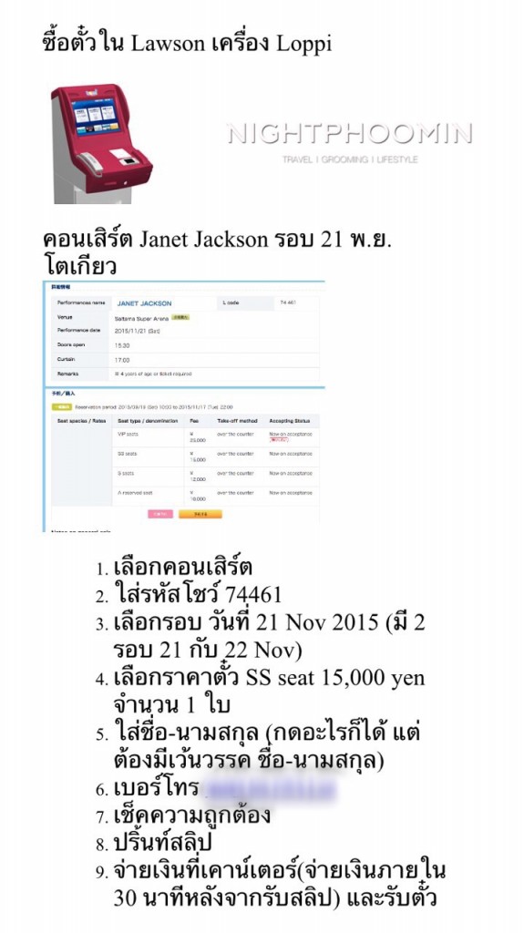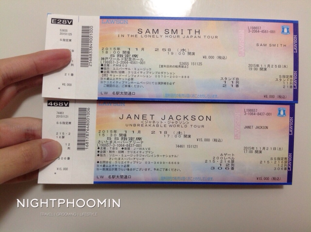 ไนท์จดรหัสการแสดงพร้อมกับวิธีการซื้อส่งให้เพื่อน เพื่อเป็นข้อมูลในการซื้อ โดยคอนเสิร์ต Janet Jackson ในโตเกียวจัด 2 วัน คือ 21-22 พ.ย. 2015 ไนท์เลือกดูแสดงวันแรก โซน SS ราคา 15,000 เยน หรือราวๆ 4,400 บาท และโชคดีที่เพื่อนพออ่านภาษาญี่ปุ่นพอออกบ้าง เลยสบายไป (ขอบคุณน้องเมย์ Bucciime.com ด้วยนะ) ส่วนข้อมูลการซื้อตั๋วคอนเสิร์ตในญี่ปุ่น อ่านที่นี้ >>> http://www.japanconcerttickets.com/howto/buying-concert-tickets-japan/