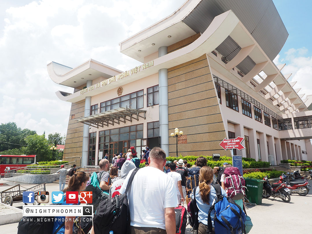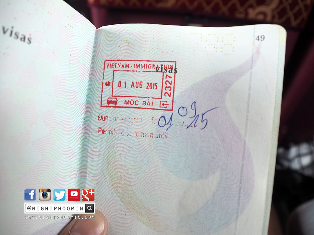 การประทับตราวีซ่าเพื่อเข้าประเทศเวียดนาม ถ้าเรามากับรถบัสเป็นหมู่คณะแบบนี้ค่อยข้างจะสบายหน่อย เพราะไกด์ที่มากับรถบัสจะเก็บพาสปอร์ตของผู้โดยสารทุกคนไปยื่นกับเจ้าหน้าที่ เราแค่รออยู่ในตัวอาคารประมาณ รอประมาณ 30 นาที เราก็ได้เข้าประเทศเวียดนามอย่างเป็นทางการแล้วครับ