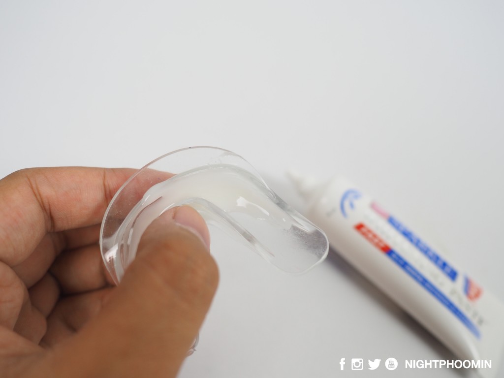 ความรู้สึกขณะใช้ … หลังจากที่เปิดกล่อง นำยาสีฟัน Sparkle Whitening Paste บีบใส่ในถาดครอบฟันให้เต็ม โดยเอียง 45 องศา เพื่อให้หน้าฟันสัมผัสยาสีฟันเยอะที่สุด ในขณะที่ใช้ 20 นาที รู้สึกเย็นสบายที่ฟันและเหงือก ไม่มีอาการเสียวฟันหรือแสบเหงือกแต่อย่างได้ (ถือว่า อ่อนโยนและไม่แพ้)