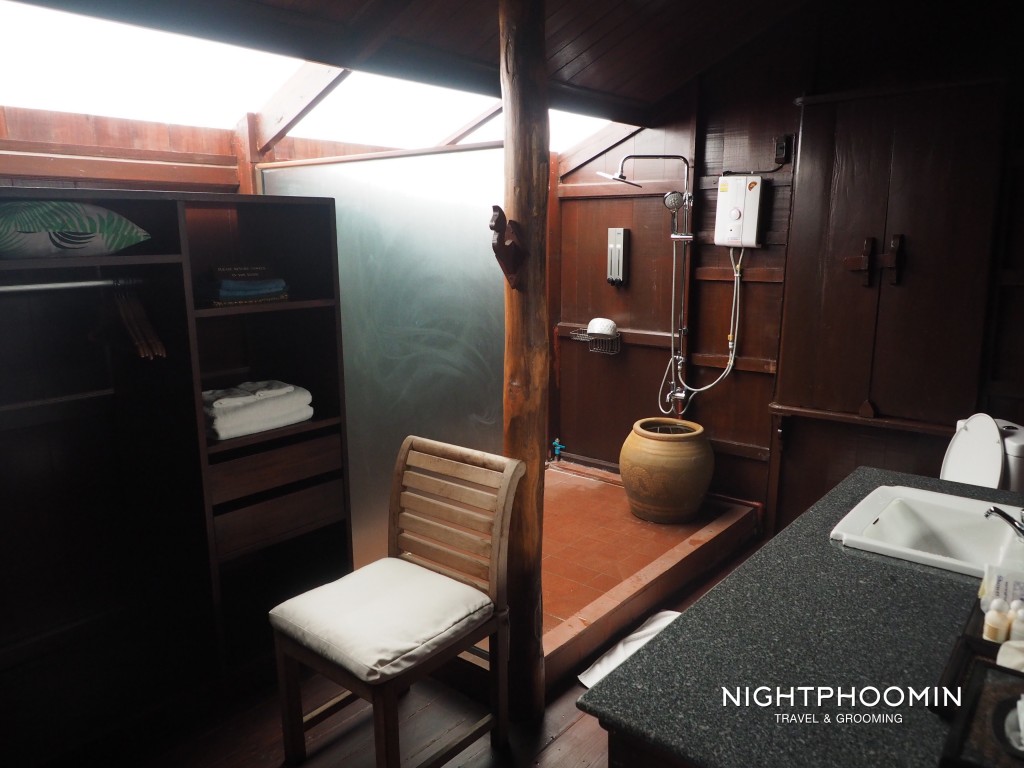 เมื่อเราเข้ามาภายในรีสอร์ทจะต้องผ่านเรือนรับรองก่อนที่จะแยกย้ายไปยังห้องพัก ที่นี้มีห้องพัก 2 แบบคือ เรือนเดียว กับ เรือนแฝด โดยทุกเรือนจะแยกสัดส่วนระหว่างห้องนอนกับห้องดูทีวีออกจากกัน เชื่อมต่อด้วยทางเดินมีโต๊ะเก้าอี้ให้เรานักดูต้นไม้และทอดอารมร์กับธรรมชาติ ส่วนห้องนอนแยกออกจากมา มีโอ่งให้ตักอาบแบบไทยหรือจะอาบแบบฝักบัวก็ได้ และทางรีสอร์ทยังเตรียมเสื้อม่อฮ้อม ผ้าถุง กางเกงเล ไว้ให้ใส่อยู่ภายในโรงแรมด้วย