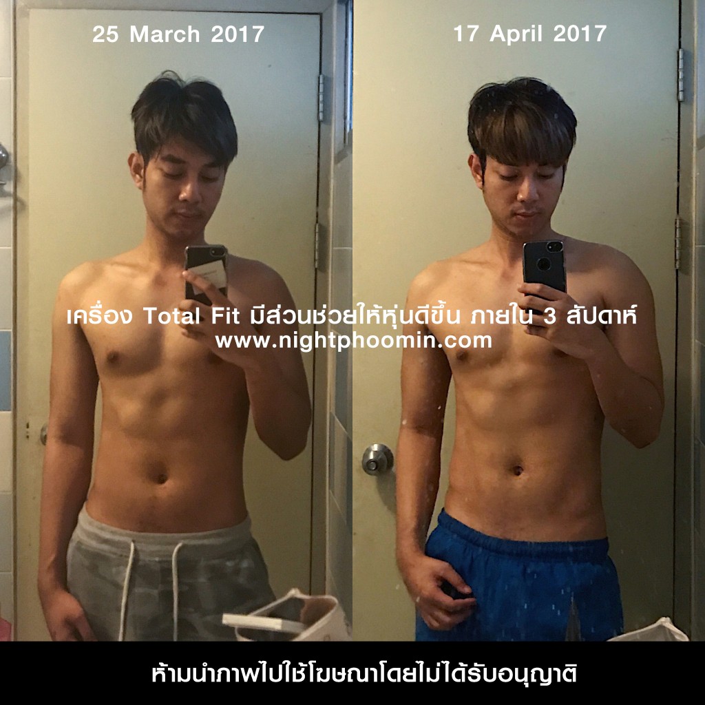 สังเกตจากภาพ ผลการใช้เพียง 3 สัปดาห์ มวลไขมันลดลง ทำให้หน้าท้องชัดขึ้น กล้ามเนื้อชัดขึ้นจากการเวทด้วยเครื่อง Total Fit