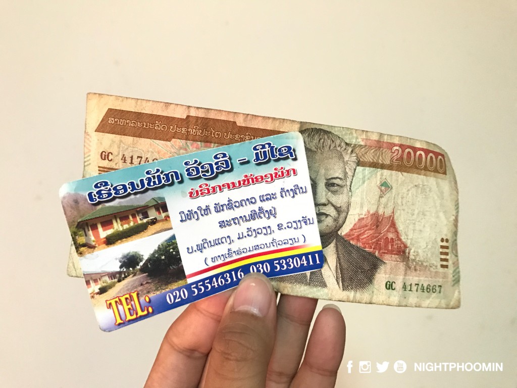 นามบัตรที่พัก กับเงิน 20,000 กีบ ที่เธอทอนให้ในตอนเช้า